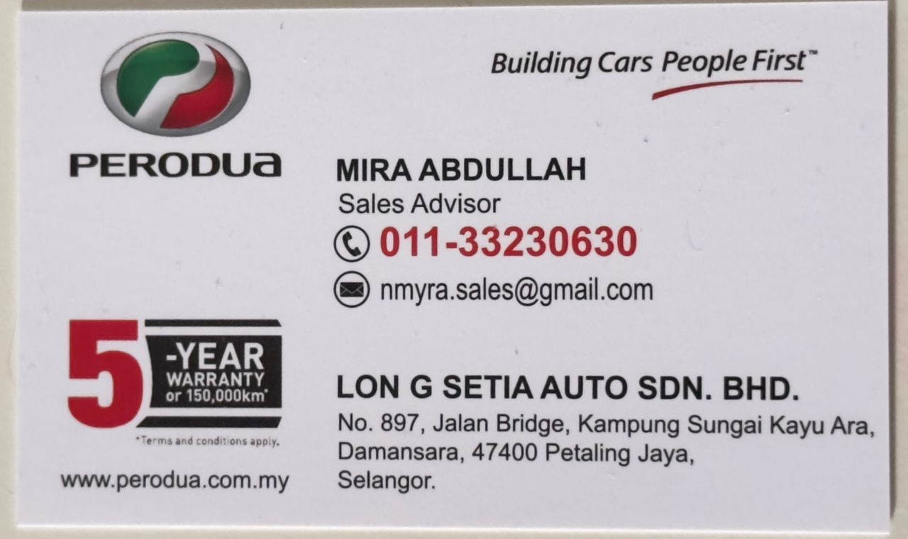 Hai! Nama saya Mira, Sales Advisor Perodua PJ yang sah. Berpengalaman lebih 1 tahun dalam bidang jualan kereta di Malaysia.